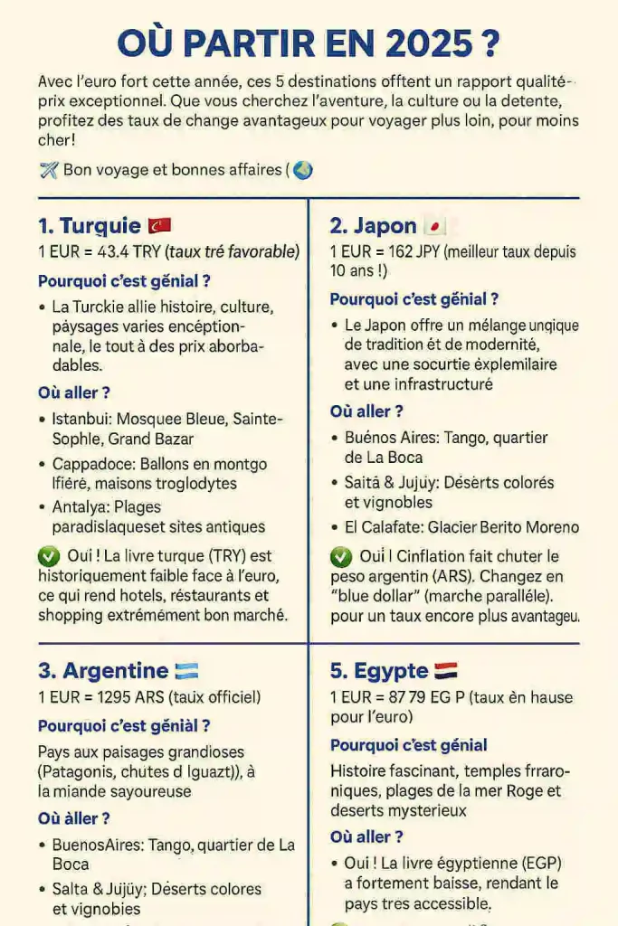 Avec l’euro fort cette année, ces 5 destinations offrent un rapport qualité-prix exceptionnel. Que vous cherchiez l’aventure, la culture ou la détente, profitez des taux de change avantageux pour voyager plus loin, pour moins cher !