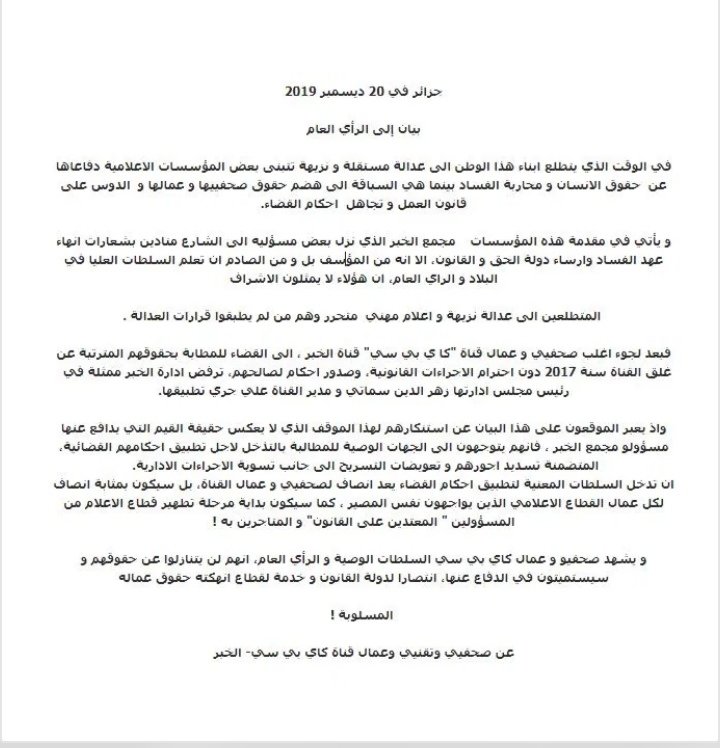 طالبَ صُحفيو وتِقنيّو وعُمال قناة كاي. بي. سي السلطات التدخلَ من أجلِ إجبار مُجمّع الخبر على تطبيق قرارات العدالة الصادرة لصالحهم. بعد لجوئهم إلى القضاء للمطالبة بحقوقهم المترتبة عن غلق القناة سنة 2017، دون تسوية وضعيتهم وفق ما تنصُّ عليه إجرتءات التصفية.