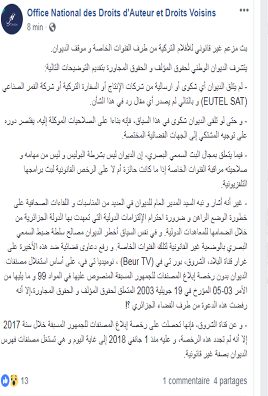 Pour Echorouk tv, l’ONDA fait savoir qu’elle n’a plus d’autorisation d’exploitation des contenus artistiques depuis le 1er janvier 2018. Toutefois, elle continue tout de même de les diffuser « illégalement ».