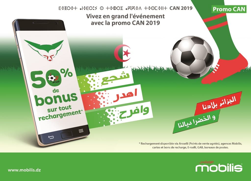 Afin de vivre la joie du grand événement africain avec ses clients, et à l’occasion de la qualification de l’Equipe Nationale à la finale de la CAN 2019, Mobilis lance une méga promo et offre 50 % de bonus sur tous les montants rechargés.