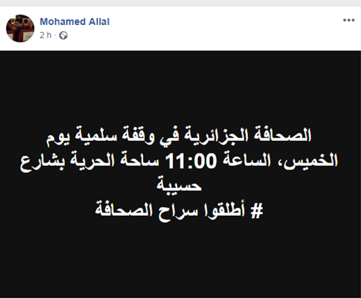 Selon une publication du journaliste et critique cinéma d’El Khabar Mohamed Allal, les journalistes peu importe leurs organes, prévoient de tenir un rassemblement de dénonciation ce jeudi 28 février à 11h du matin à la place de la liberté de la presse, située à la rue Hassiba Ben Bouali à Alger.