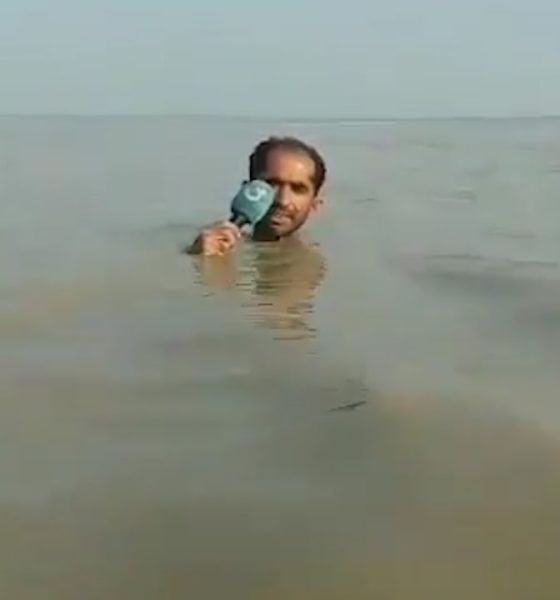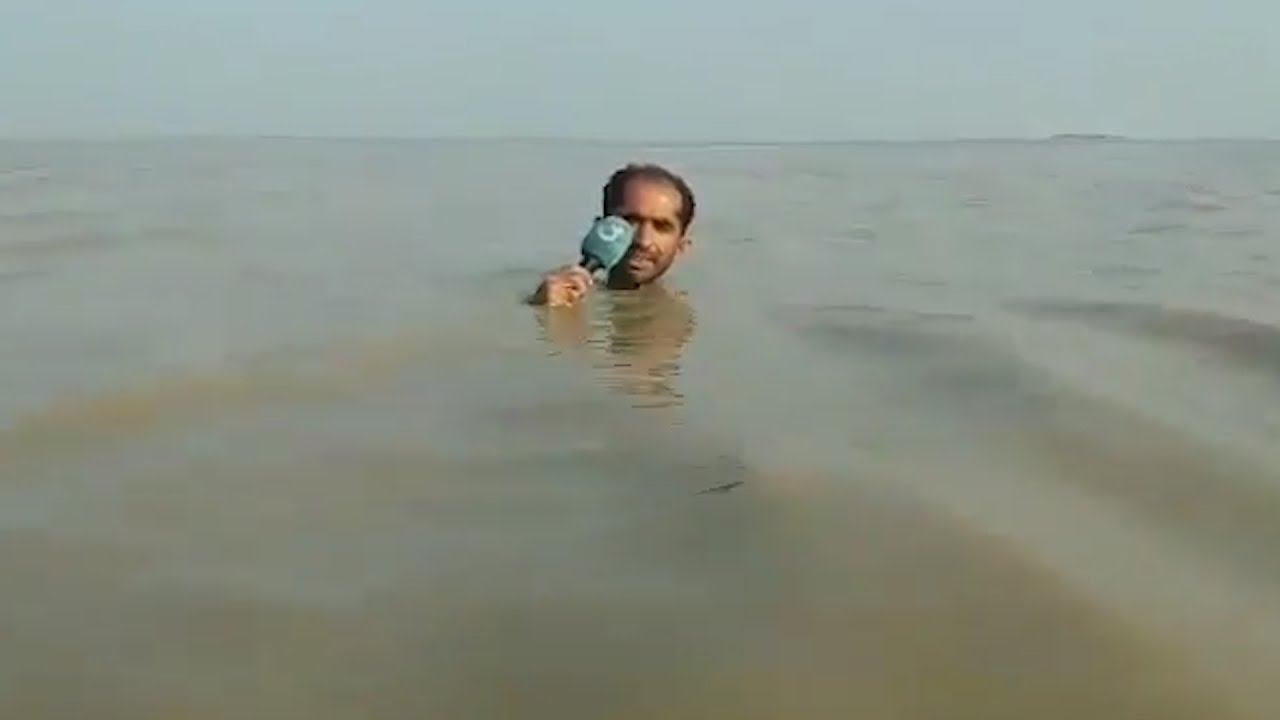 « معكم من تحت الماء المراسل الصحفي آزادار حسين » هكذا فضل هذا المراسل اختتام تقريره بطريقة فريدة من نوعها، والتي تناقلها رواد الفايسبوك بسرعة البرق، فمراسل هذه الفضائية الباكستانية نقل خبر غرق البلاد من وسط المياه التي ارتفع منسوبها بسبب الفيضان، فلم يظهر منه سوى رأسه، وغمرت المياه باقي جسده.
