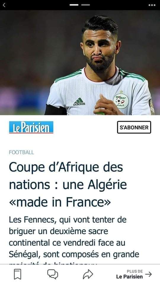 نشرت جريدة « البارزيان » الفرنسية عبر موقعها الرسمي بصفحتها الرياضية، مقالا تحدثت فيه عن إنجازات المنتخب الوطني الجزائري بكأس أمم إفريقيا، والذي تم حسبها عن طريق اللاعبين الفرنسيين حيث عنونت المقال ب »كأس الأمم الأفريقية » الجزائر بصناعة فرنسية« .