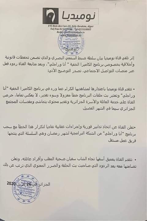 قامت قناة نوميديا تيفي وبعد تلقيها لإنذار من قبل سلطة ضبط السمعي البصري، بإلغاء برنامج الكاميرا الخفية أنا وراجلي، الذي قوبل بموجة من الغضب والسخط من قبل المشاهد الجزائري.