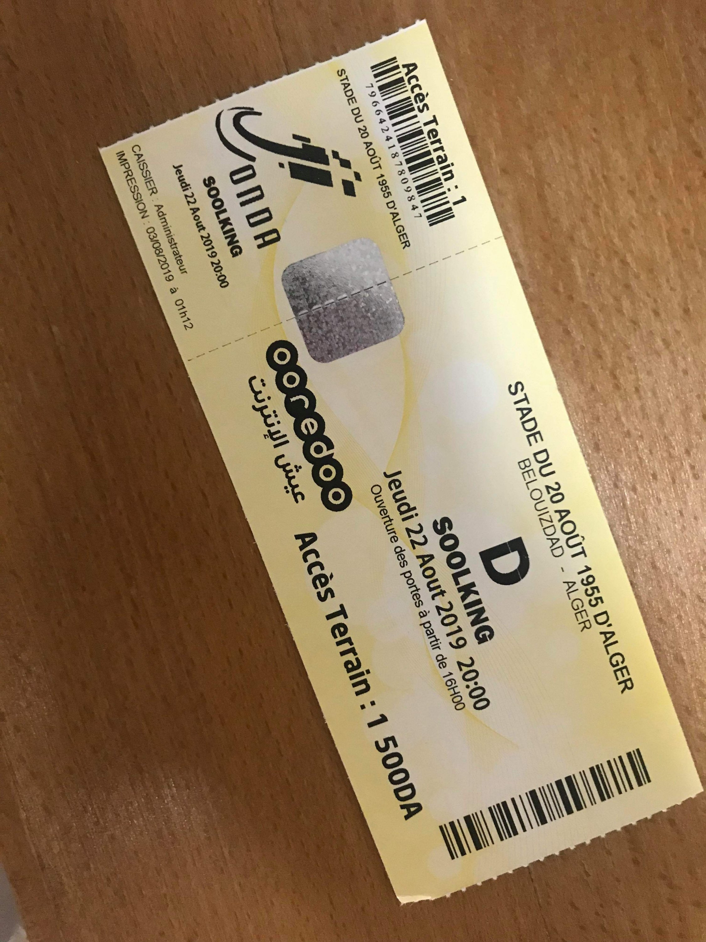 ووصل المغني العالمي سولكينغ إلى الجزائر فجر الثلاثاء، من أجل الاستعداد والتحضير لحفلته الأولى في الجزائر، وتم تحديد سعر تذاكر الحفل، بمبلغ 1500 دينار، حيث شهدت اقبالا جماهريت كبيرا من قبل الشباب والعائلات، نظرا للمكانة الفنية الكبيرة التي يحظى بها صاحب رائعة « لا ليبرتي » في قلوب الجزائريين، حيث وصل سعرها في السوق السوداء إلى ما يقارب 5000 دج.