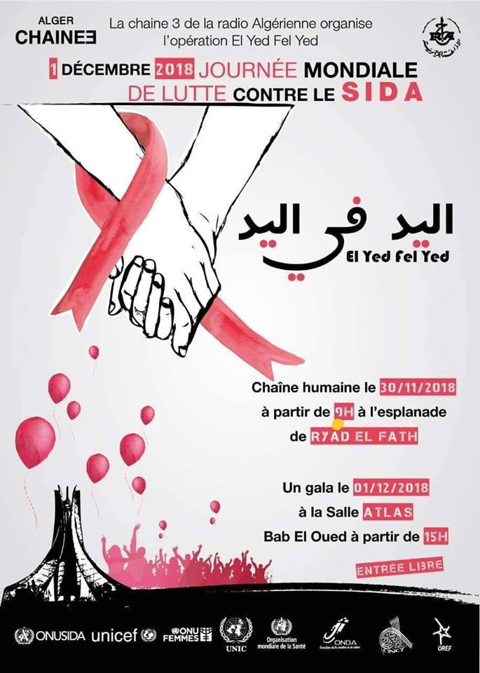 Comme chaque année la Chaîne 3 de la radio algérienne organise l’opération El Yed Fel Yed. L’événement aura lieu le 30 novembre ( à partir de 9h30) prochain à l’esplanade de Ryad El Fath pour lutter et sensibiliser contre le SIDA.