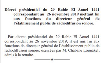 En effet, le dernier numéro du JO a porté dans sa 24eme page le décret présidentiel du 29 Rabie El Aouel 1441 correspondant au 26 novembre 2019 mettant fin aux fonctions du directeur général de l’établissement public de radiodiffusion sonore. Chabane Lounakel est selon ce même décret admis à la retraite.