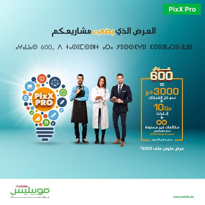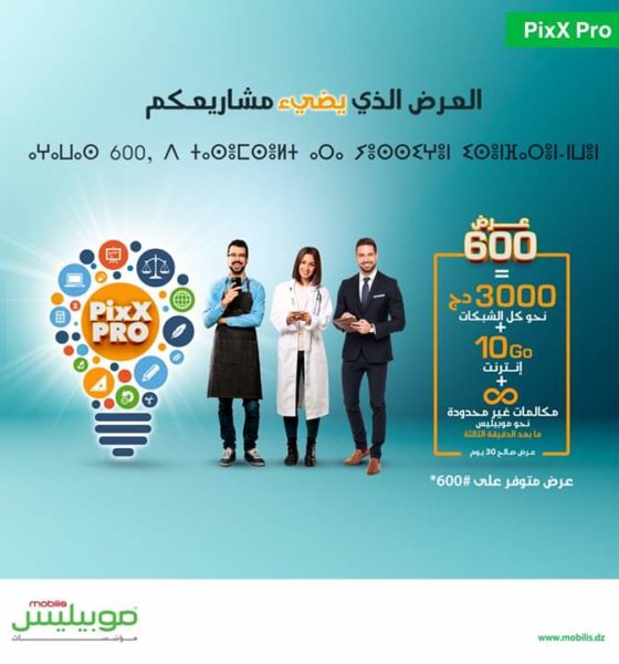 Avec le plan « PixX Pro 600 », les abonnés existants et/ou potentiels ; profiteront d’une offre prépayée multi-usage qui s’adapte au rythme de chacun. Ainsi, la PixX Pro 600 accessible via *600# ; procure à la communauté professionnelle d’avantages multiples et généreux en Appels, SMS et Internet pour seulement 600 DA / le mois.